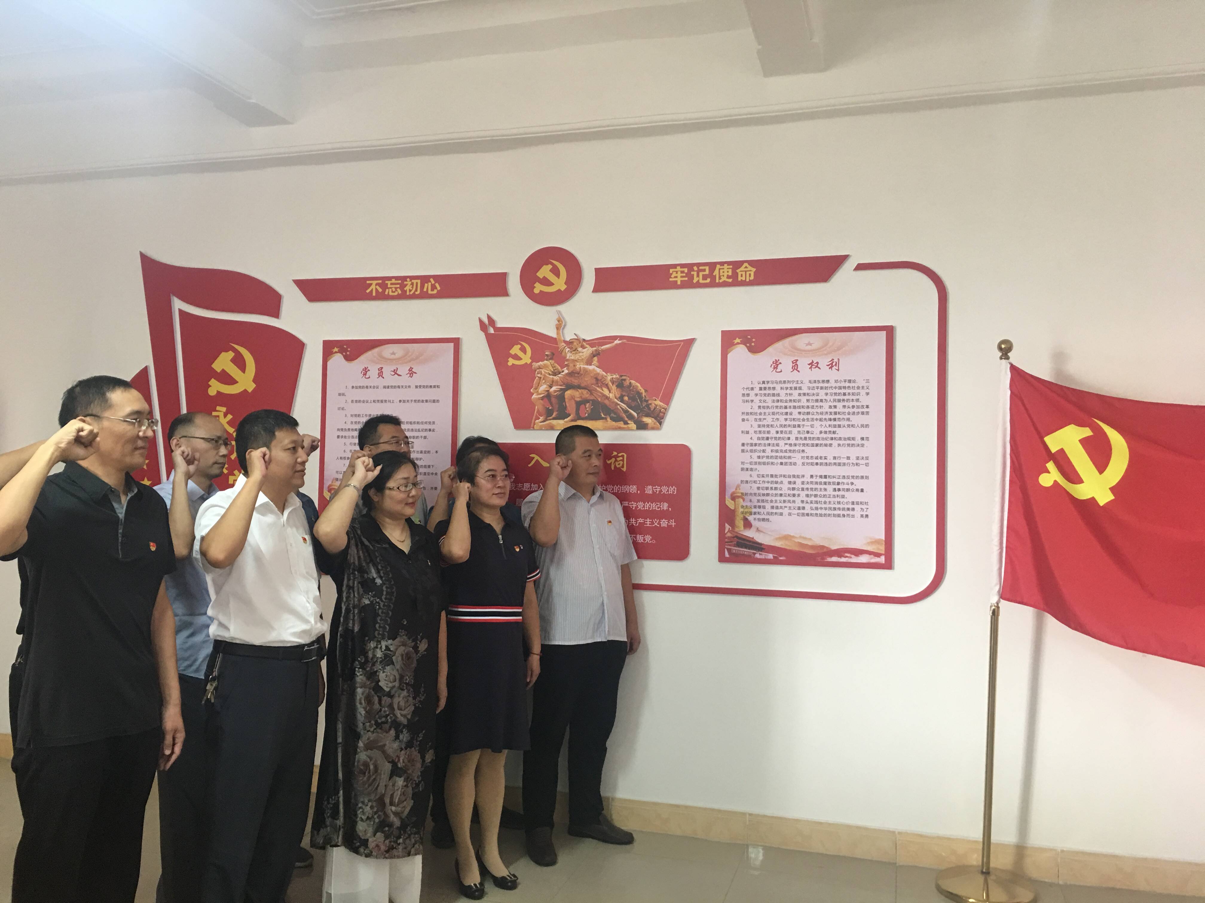 面对党旗,大家庄严做出承诺:我是一名中国共产党员,我一定要“不忘初心、牢记使命”,坚决做到“十个严禁”。真诚接受党组织和广大干部职工的监督,如有违反,愿接受组织严肃处理。
