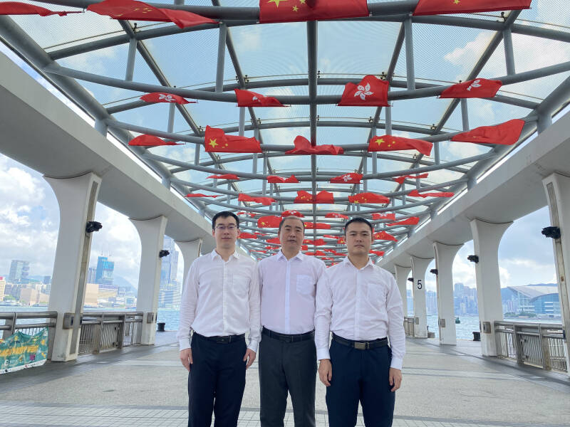 图为驻香港员工在中环码头开展“我与国旗合个影”活动