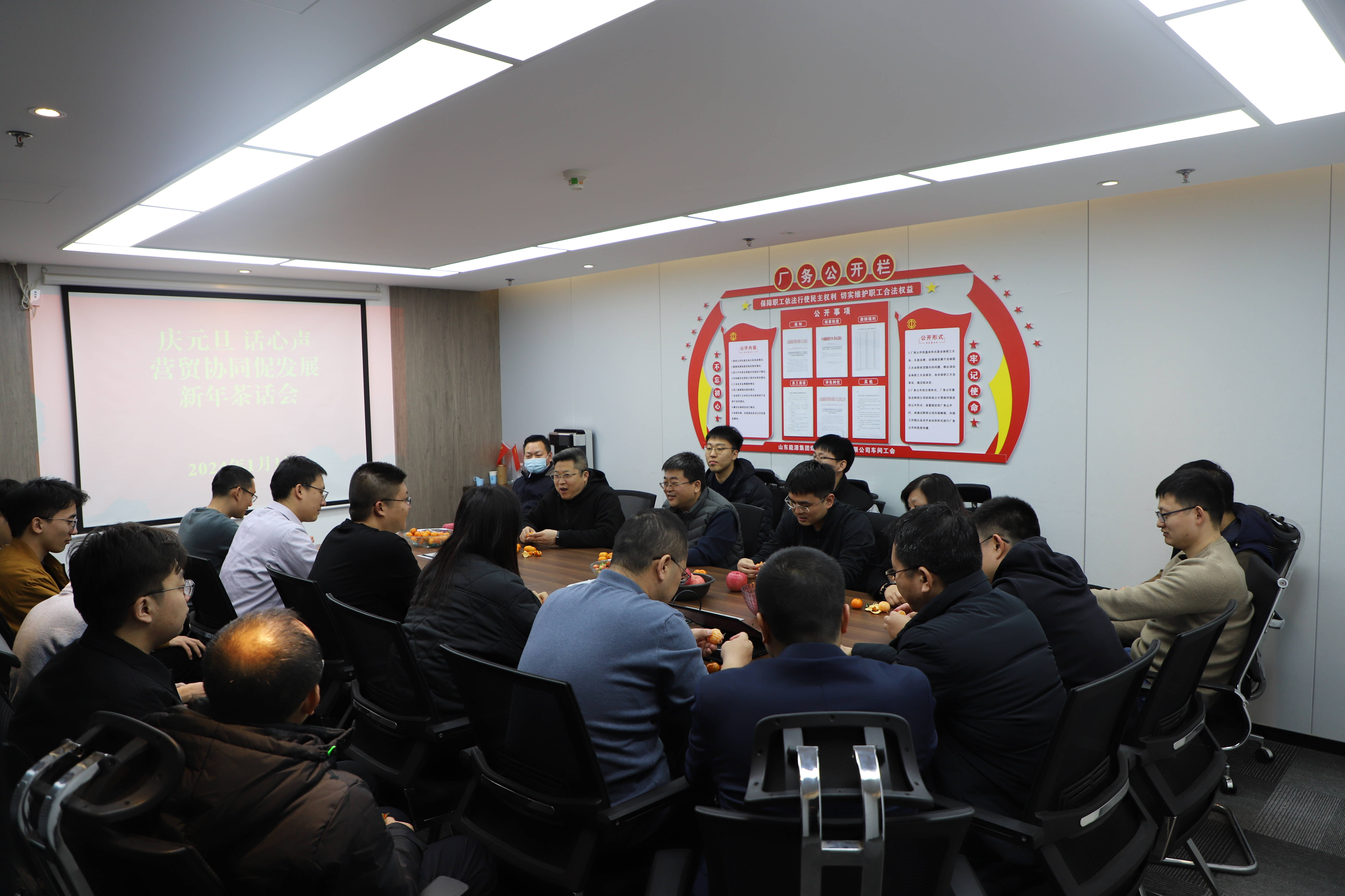 本网陕西讯 为进一步丰富驻外职工的精神文化生活,营造浓厚的新春气氛。1月1日下午陕西公司组织开展庆元旦、话心声、营贸协同促发展新年茶话会活动。陕西公司在岗职工和营贸公司驻陕西地区单位代表共同出席本次活动。