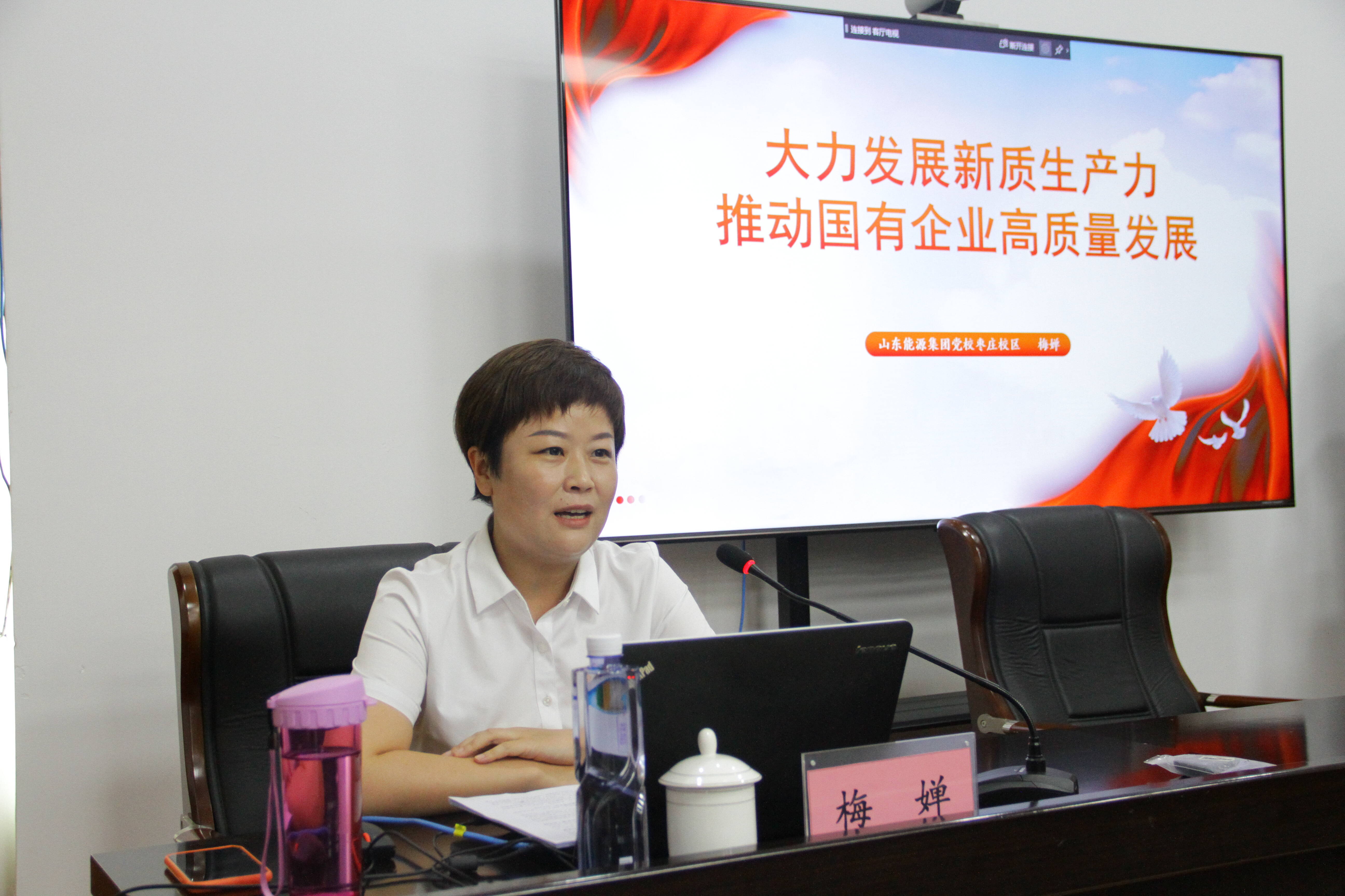 开班仪式结束后,山东能源集团党校枣庄校区企管研究室主任、讲师梅婵围绕“大力发展新质生产力,推动国有企业高质量发展”这个主题,从“新质生产力的基本内涵和战略定位、新质生产力是高质量发展的内在要求、以新质生产力推进国有企业高质量发展”三个方面举事例、摆数据,深入浅出地讲解了新质生产力的内涵、培育新质生产力的重要意义和基本路径,为全体党员在下一步更好地贯彻落实能源集团、营贸公司发展战略,推动营销工作高质量发展提供了理论指导。