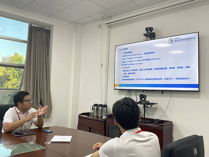 此次培训以去年入职大学生分享成长经历和心得的形式开展。从最初学习ERP系统、到分品种了解该公司贸易流程,到重点关注合同条款的标的、价格、付款、保险等内容......培训人员围绕单证工作实际一一展开,内容由浅及深,高度贴合业务应用。为确保新入职大学生能更快速、更充分理解专业内容,培训人员还结合自身工作认知和理解,通过联想、比喻等语言“加工”的形式,将晦涩难懂的专业术语转化为易于接受和理解的知识讲解。新入职大学生认真听、仔细记,不时与培训人员互动交流、踊跃发问。