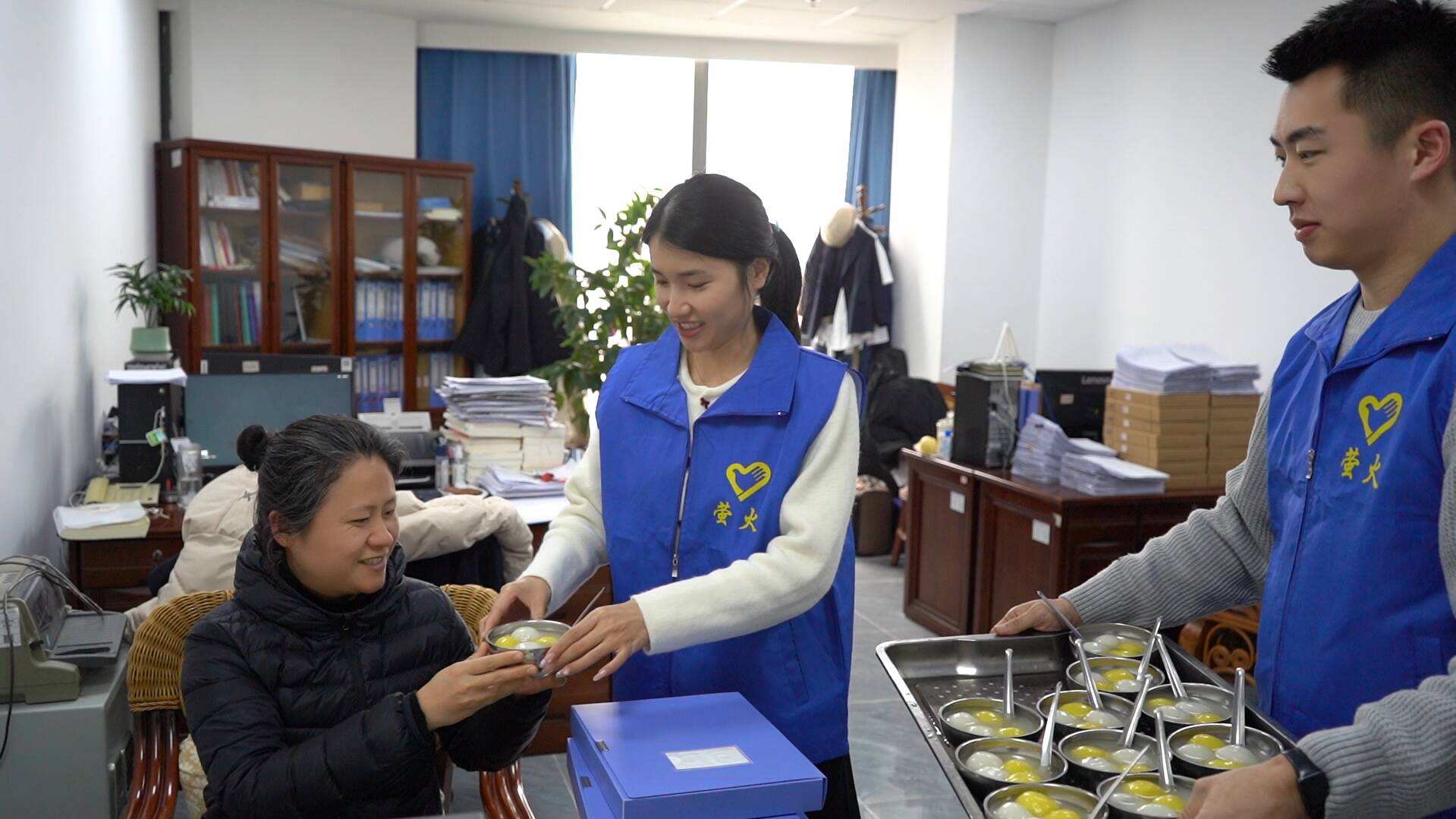 图为青年志愿者送元宵