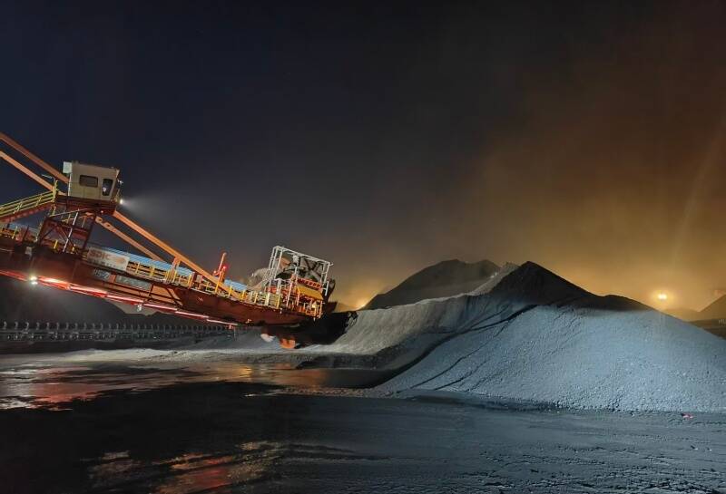 图为裕龙岛港煤炭夜间装卸现场