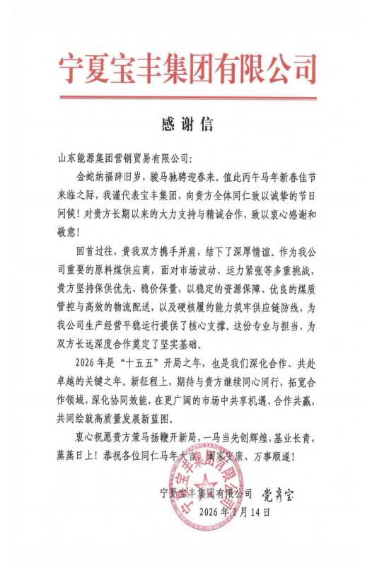感谢信中提到,回首过往,双方携手并肩,结下了深厚情谊。宝丰集团对营贸公司与鄂尔多斯公司在过去一年中的专业服务和硬核履约能力给予充分肯定,并表示双方在长期合作中彼此成就、携手同行,为产业链上下游协同发展树立了典范。信中还指出,2026年是“十五五”开局之年,也是双方深化合作、共赴卓越的关键之年,期待继续同心同行,拓宽合作领域,深化协同效能,共同绘就高质量发展新蓝图。