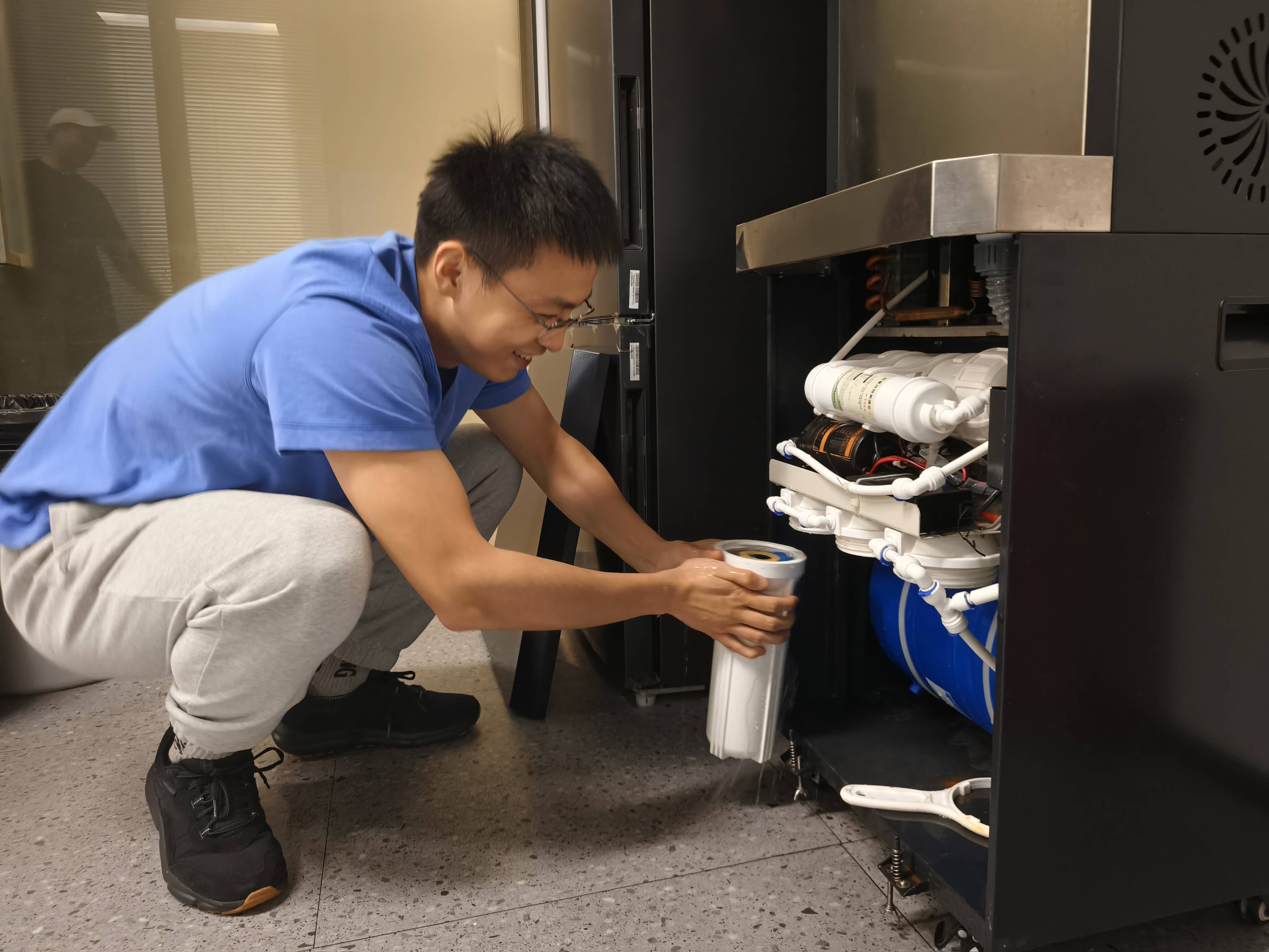图为后勤人员对办公区域饮水设备进行滤芯更换现场